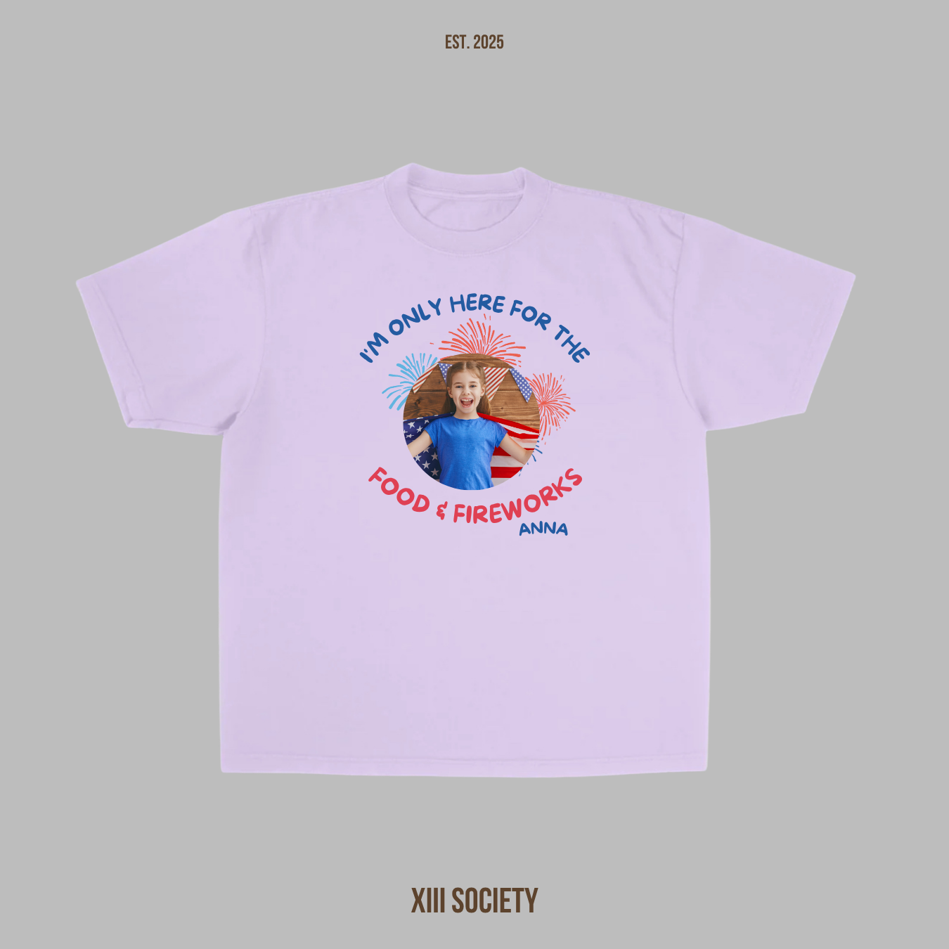Show off your patriotic spirit with our exclusive "I'm Only Here for Food & Fireworks" custom t-shirt design, featuring a fun graphic of a young girl in front of an American flag.