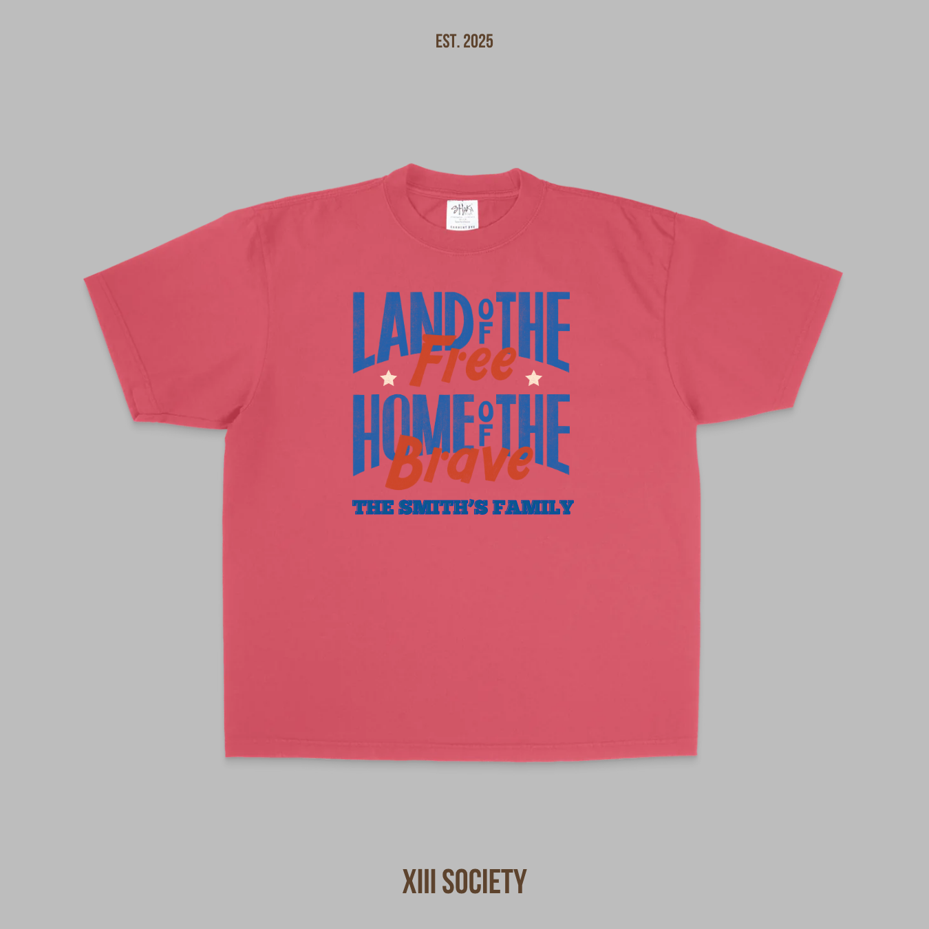 -Text: "LAND OF THE FREE HOME OF THE BRAVE" in large, blue and orange letters, conveying a sense of freedom and bravery.