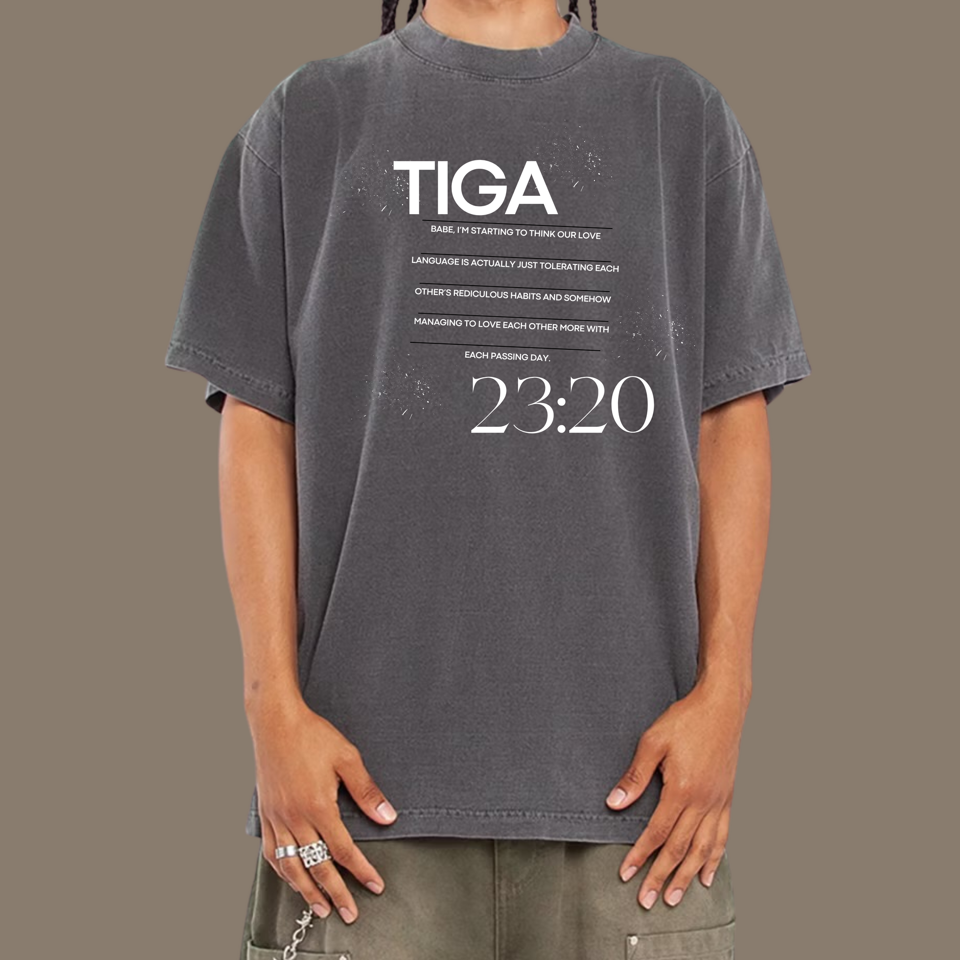 Wear your heart on your sleeve with our custom tee featuring the quote: 'TIGA BABE, I'M STARTING TO THINK OUR LOVE LANGUAGE IS ACTUALLY JUST TOLERATING EACH OTHER'S RIDICULOUS HABITS AND SOMEHOW MANAGING TO LOVE EACH OTHER MORE WITH EACH PASSING DAY.' Perfect for anyone who's learned to love the imperfections in their relationship.