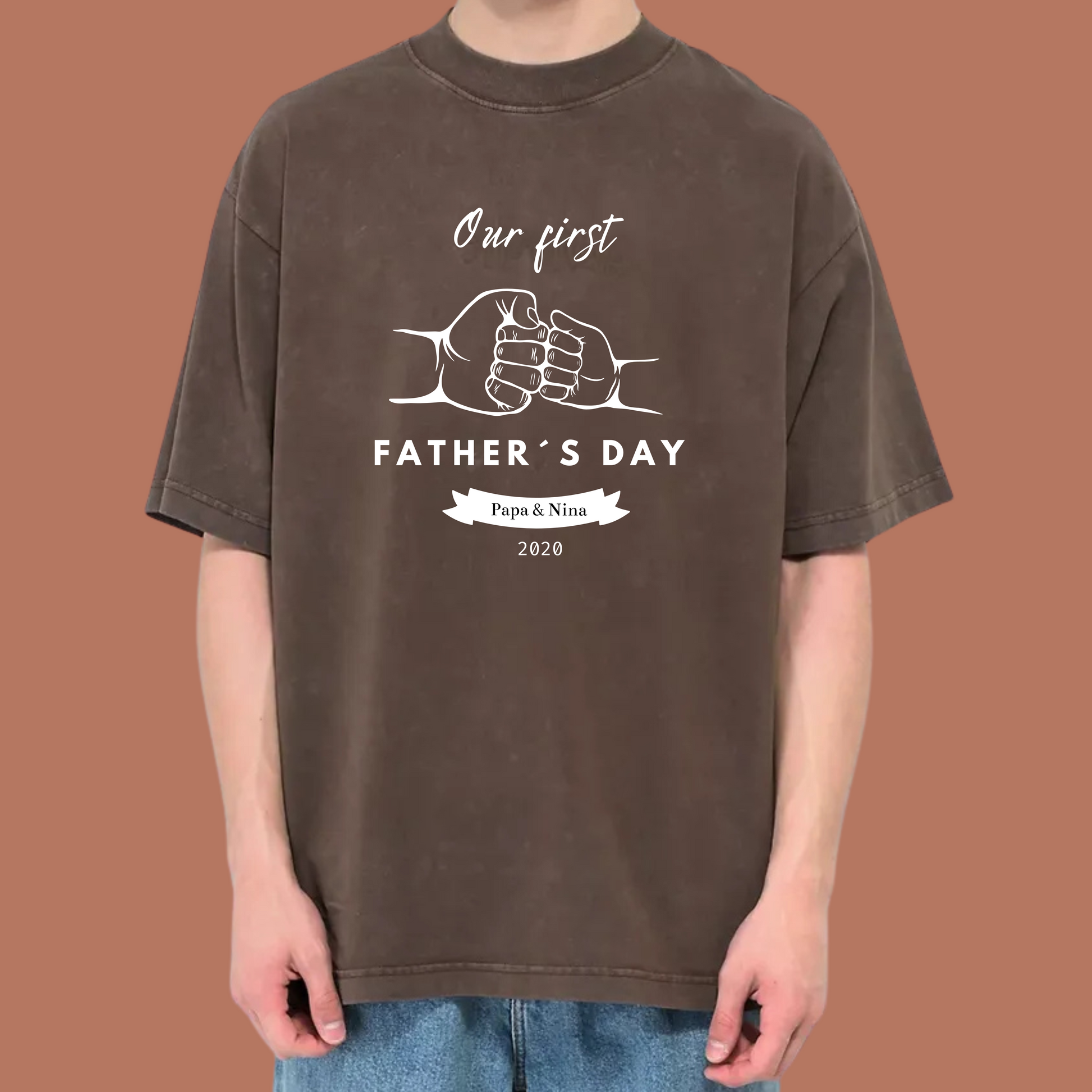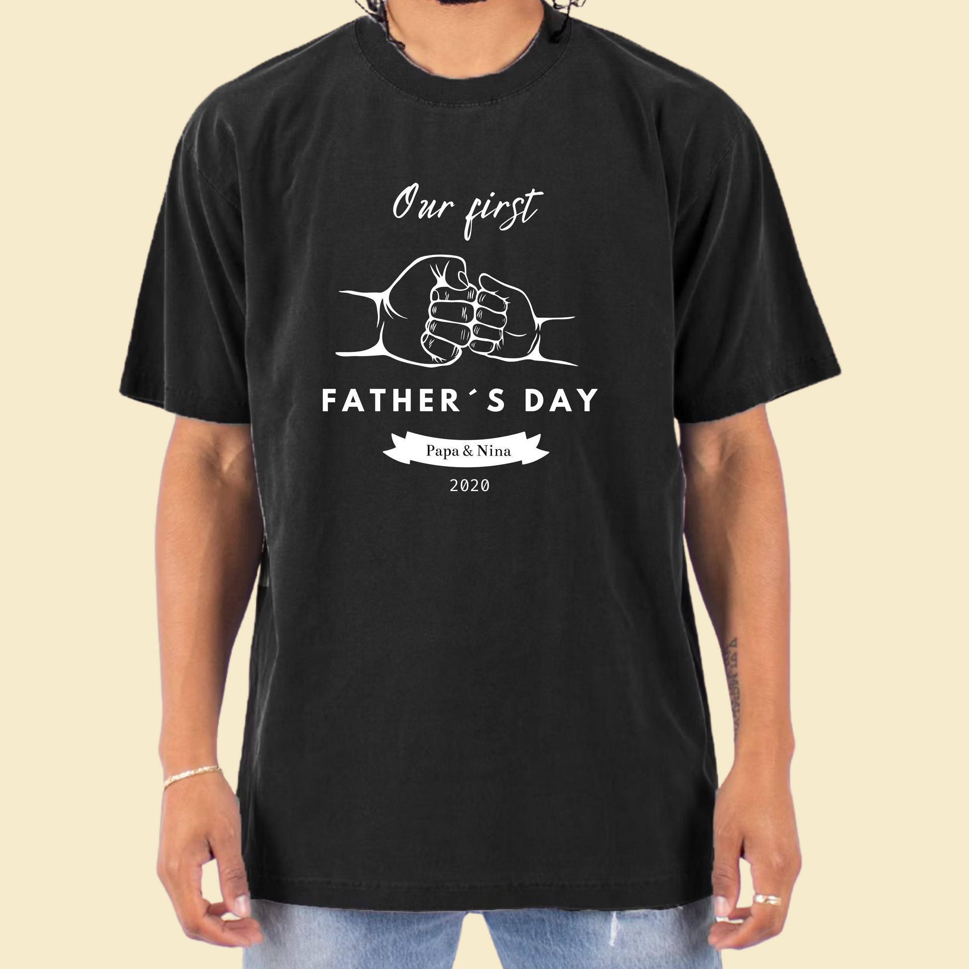 Celebrate your first Father's Day with our unique and meaningful custom design! This special illustration features two fists bumping together, representing a celebratory gesture.