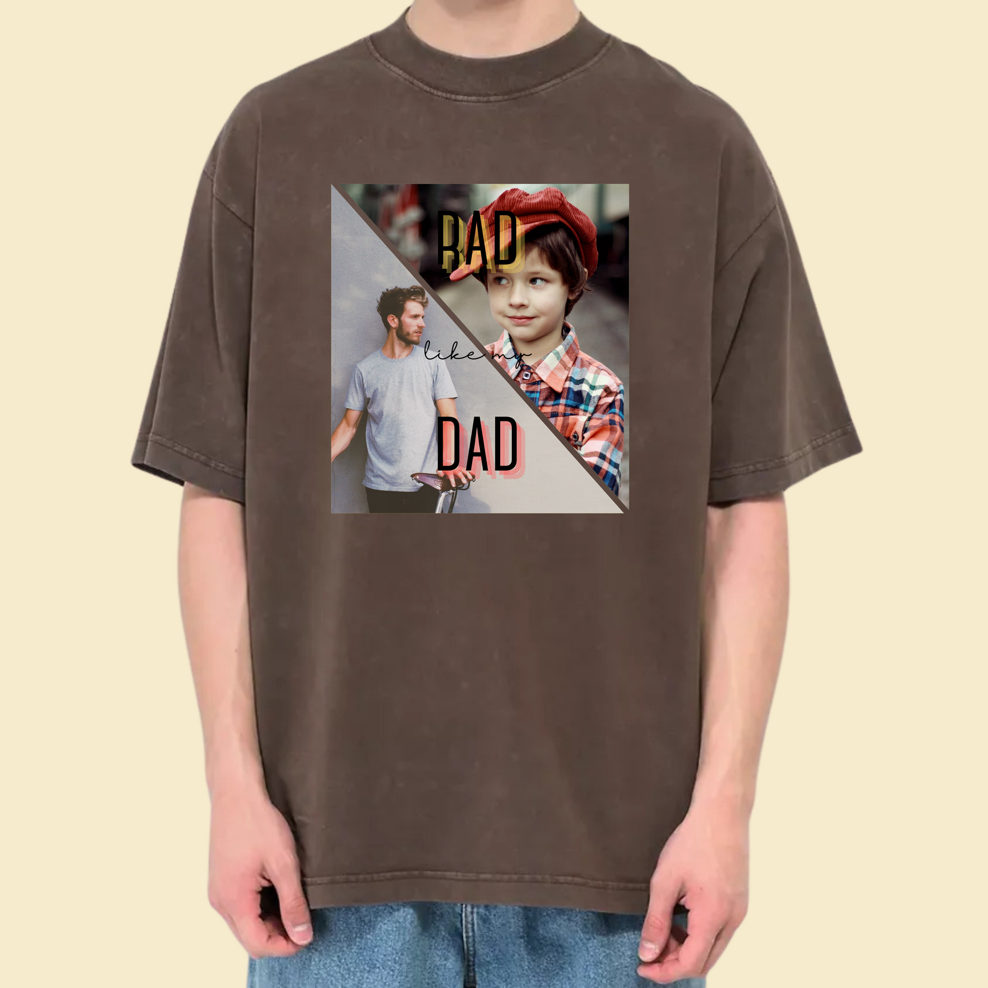 Get ready to unleash your inner radness with our hilarious “Rad Like My Dad” custom t-shirt! This unique design features two fun photos - one of a child looking mischievous with the word "RAD" over their face, and another of a dad being cool with the word "DAD" over his image. The perfect way to show off your dad's rad side!