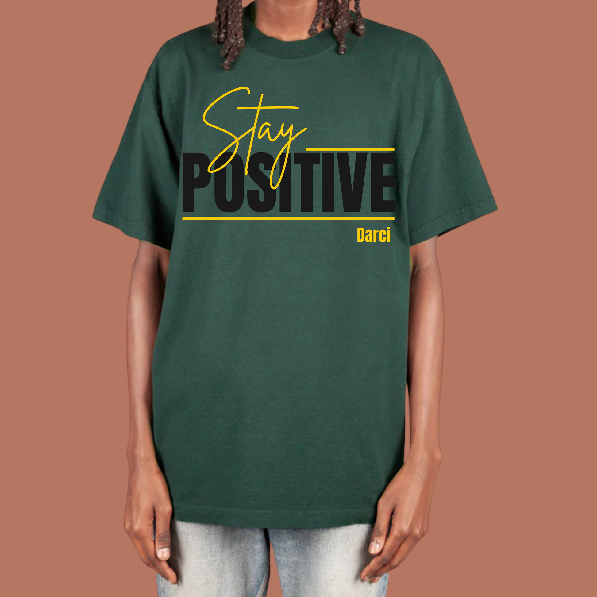 Brighten up your wardrobe with our custom "Stay Positive" t-shirts! Perfect for anyone looking to spread good vibes and confidence, these tees are designed to make you feel uplifted and inspired.